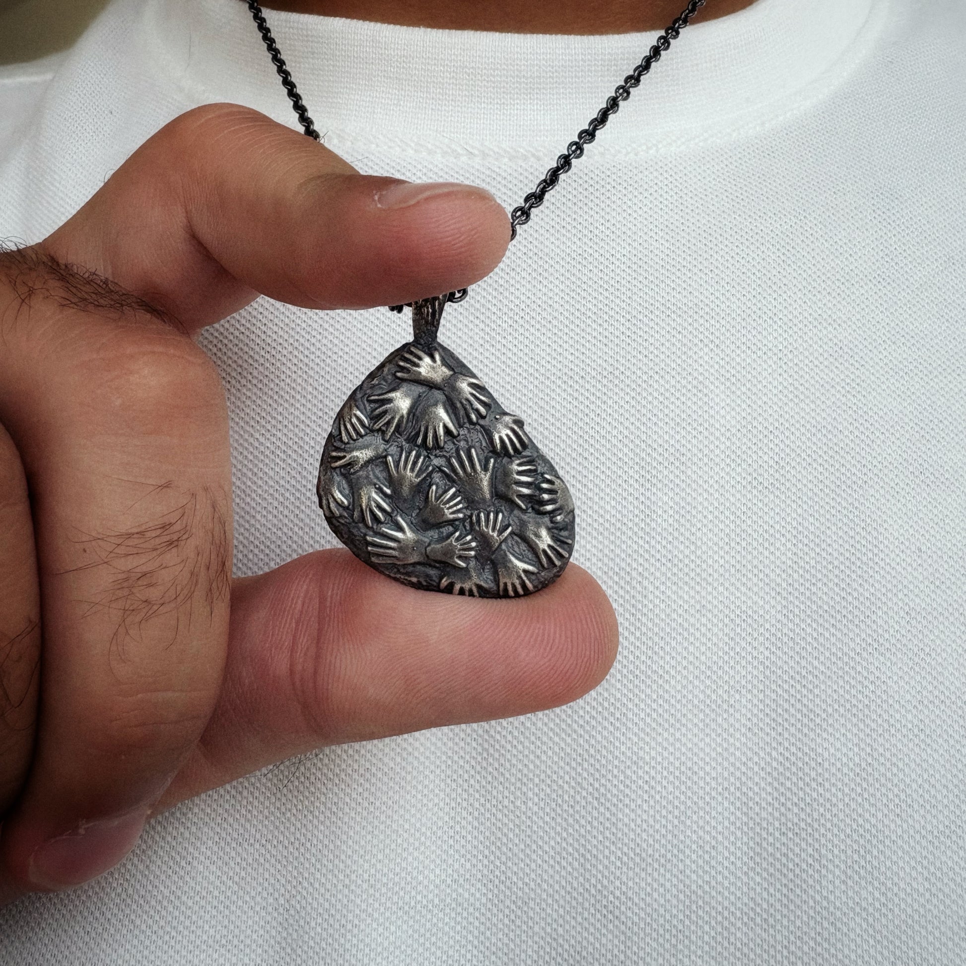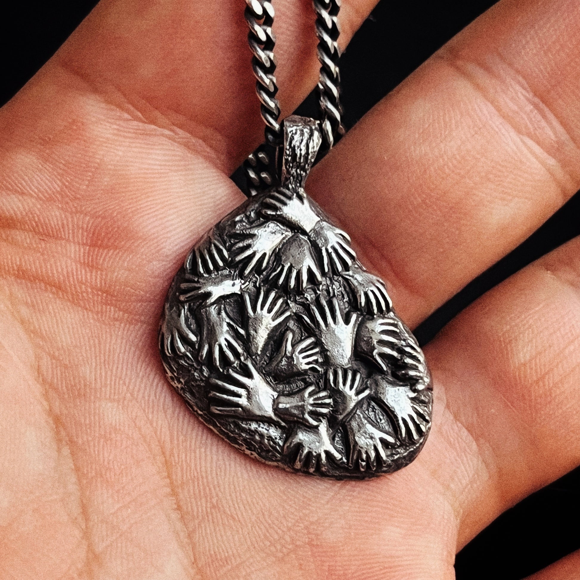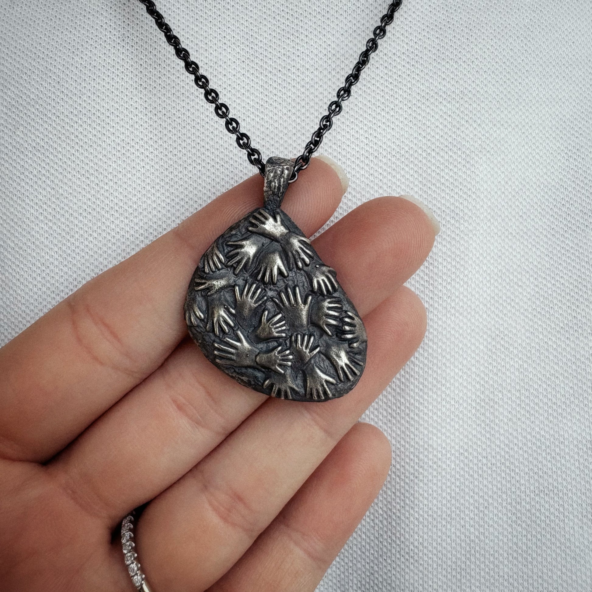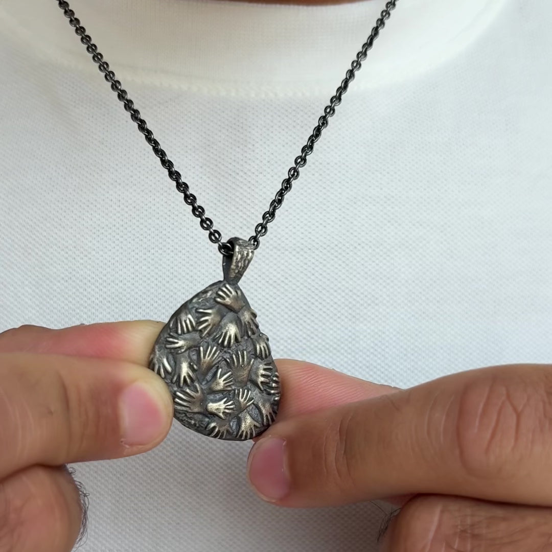 This piece is inspired by the ancient cave art found in Cueva de las Manos — “The Cave of the Hands” — in Argentina. The walls of the cave are covered with hundreds of stenciled handprints, left by some of the earliest inhabitants of South America between 7,300 BC and 700 AD. It is widely recognized as the oldest-known cave art in South America.