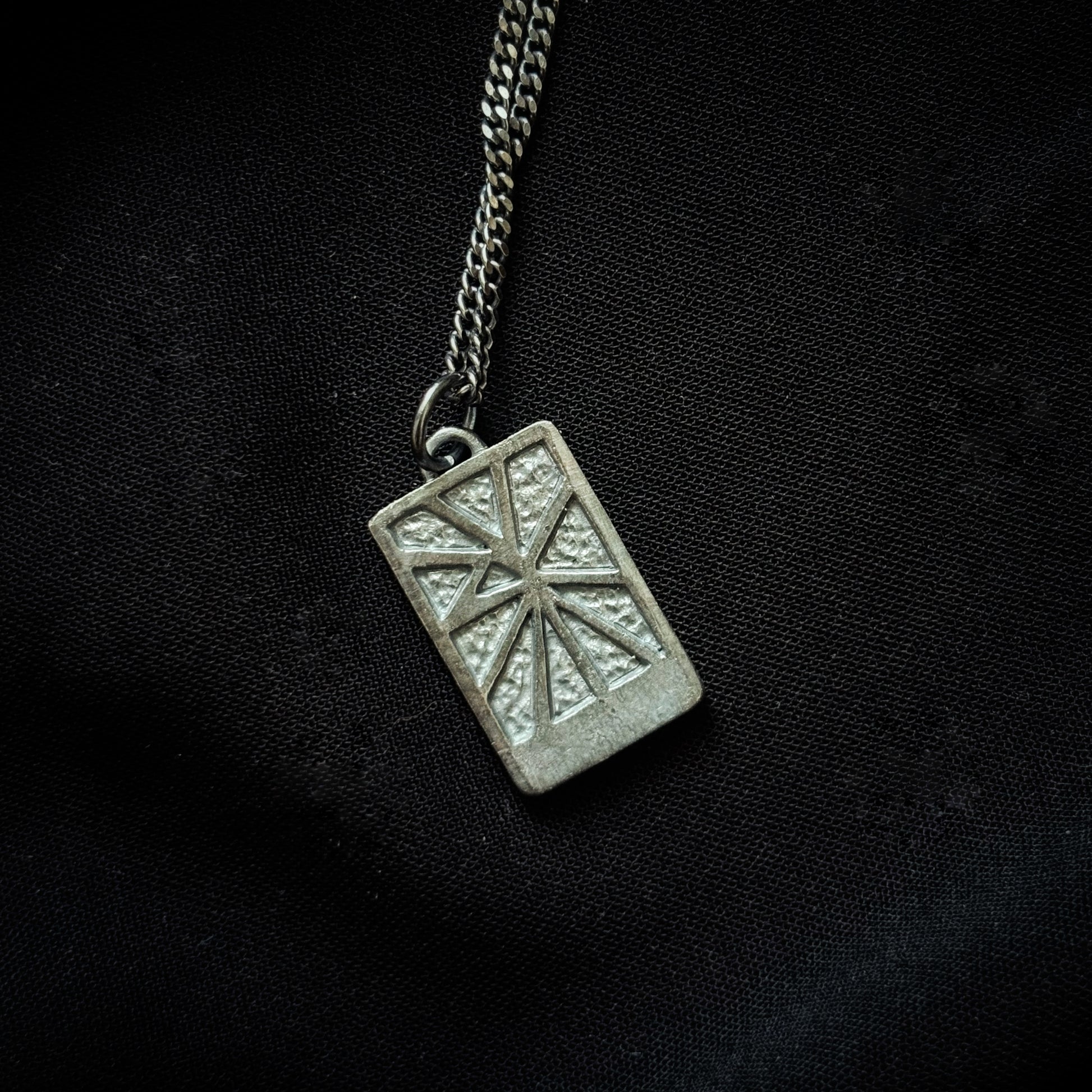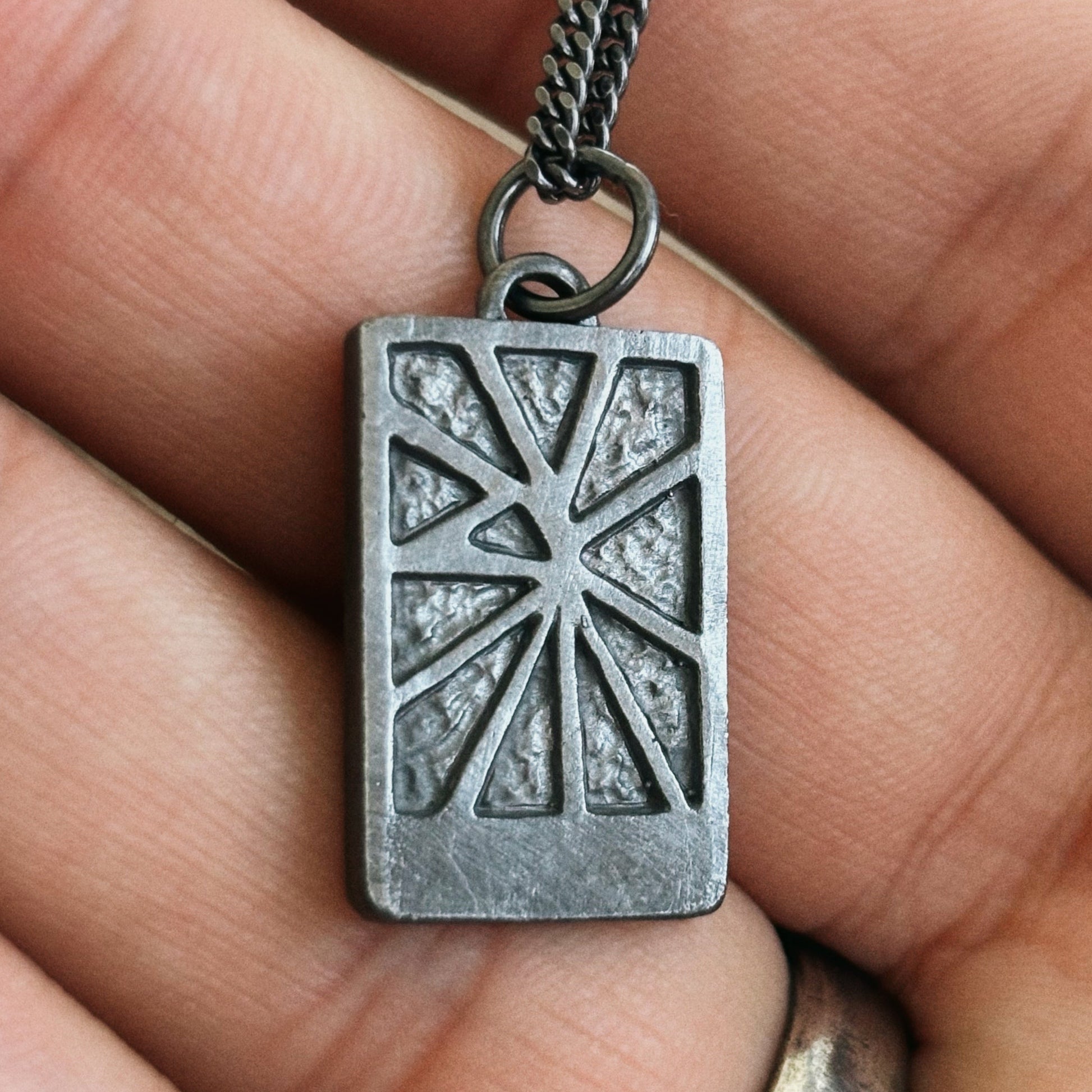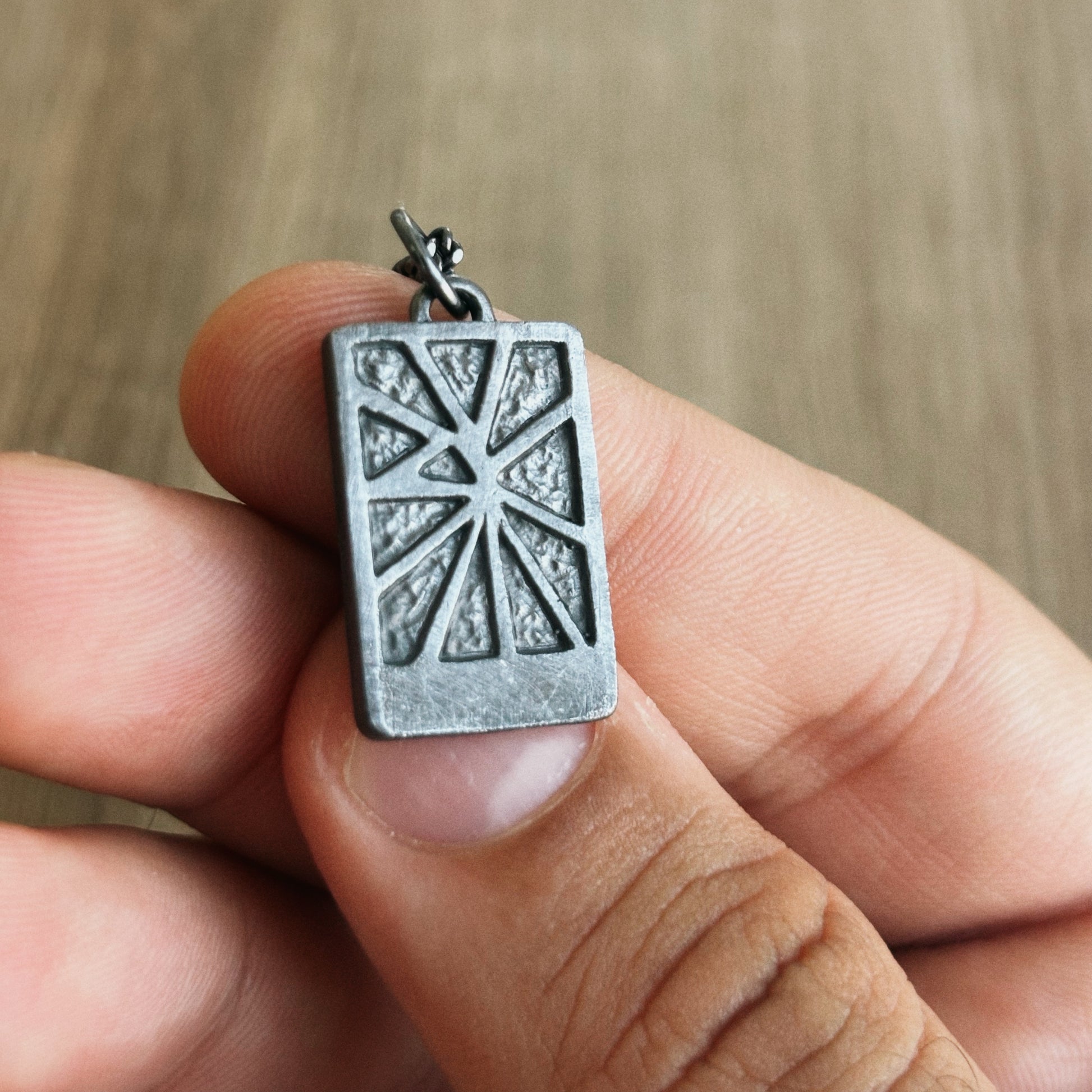 This necklace was created in order to capture that feeling. The geometric lines are designed to mimic rays of sunlight breaking through tree branches.