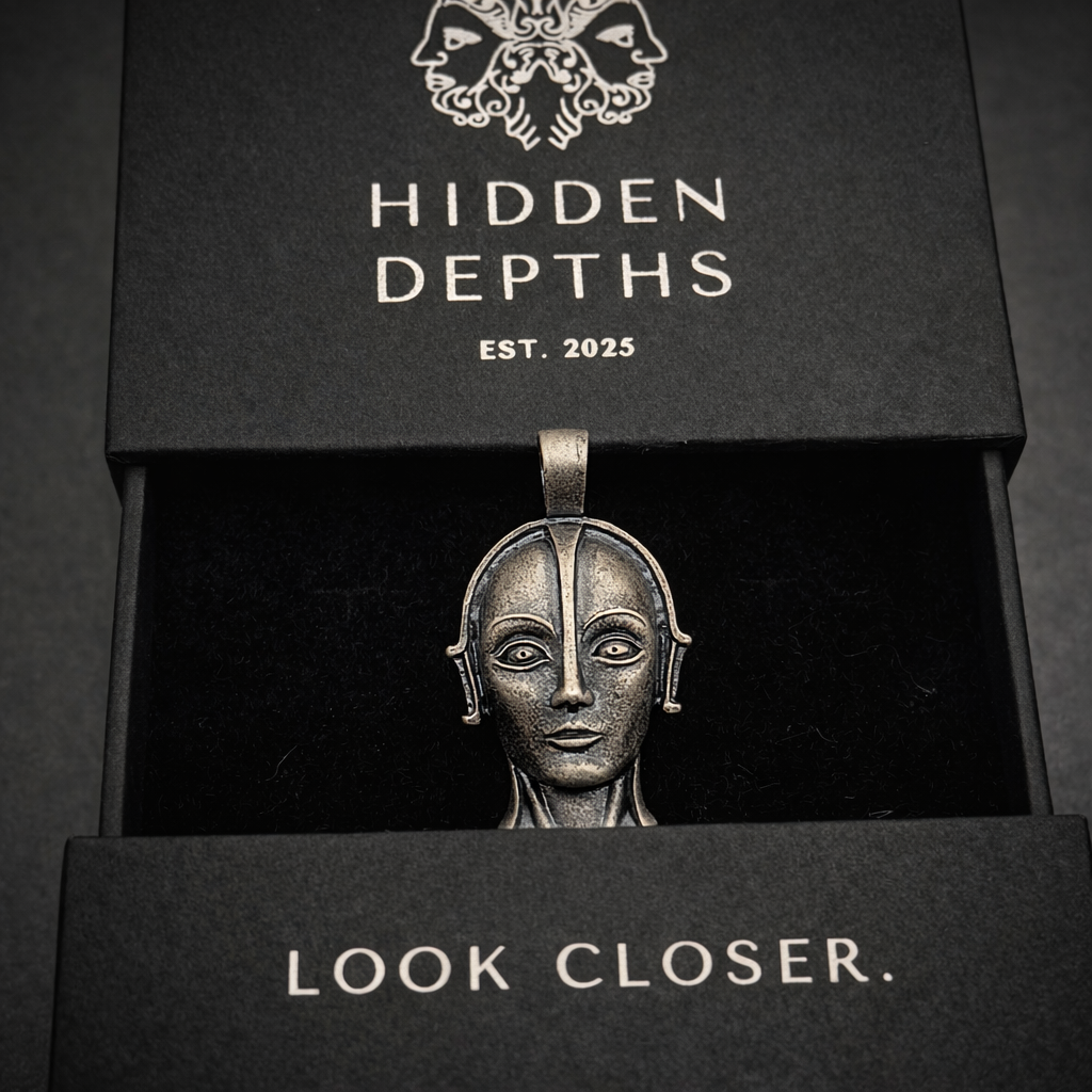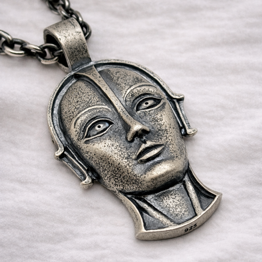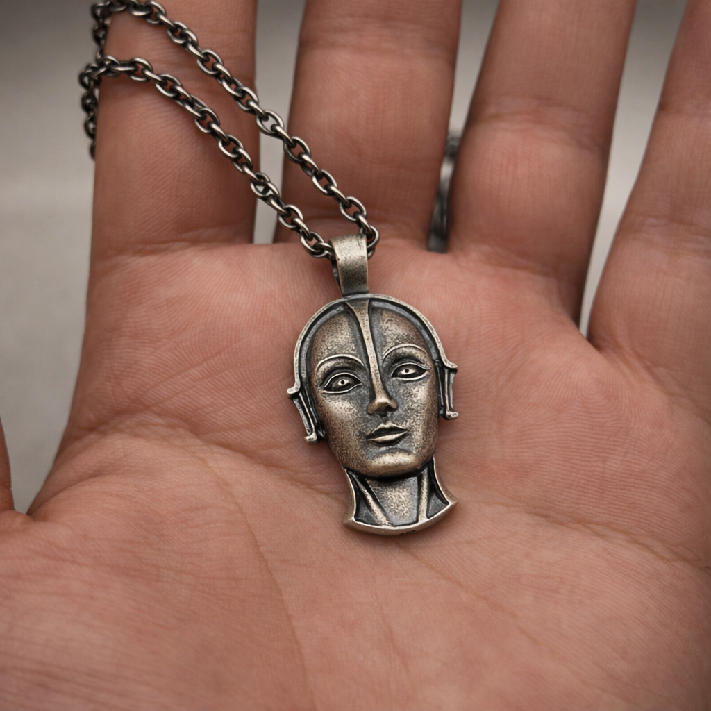 Introducing our Metropolis Robot Necklace: an Art Deco–inspired silver pendant created for cinema lovers and silent film enthusiasts, drawing inspiration from the classic film Metropolis, directed by Fritz Lang.