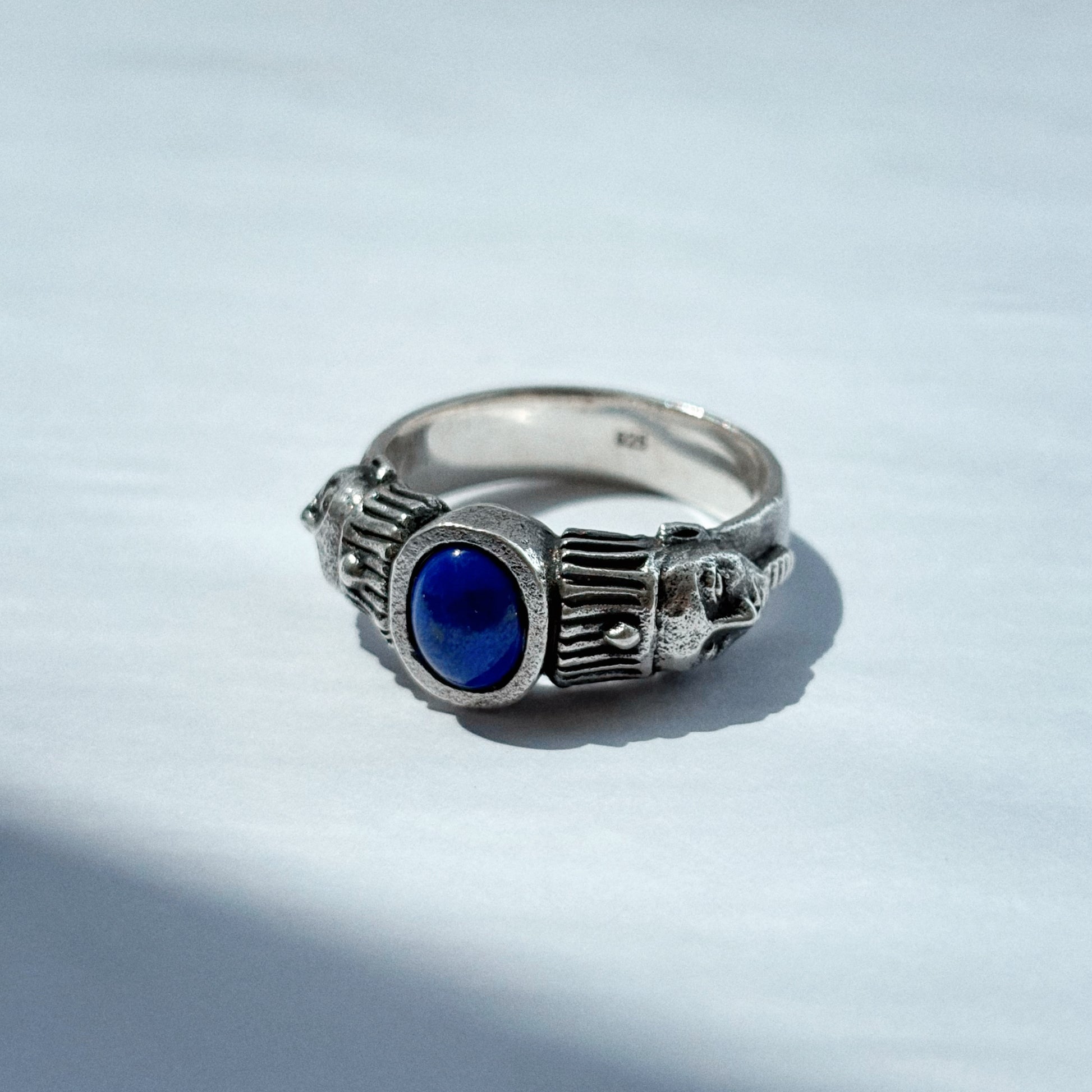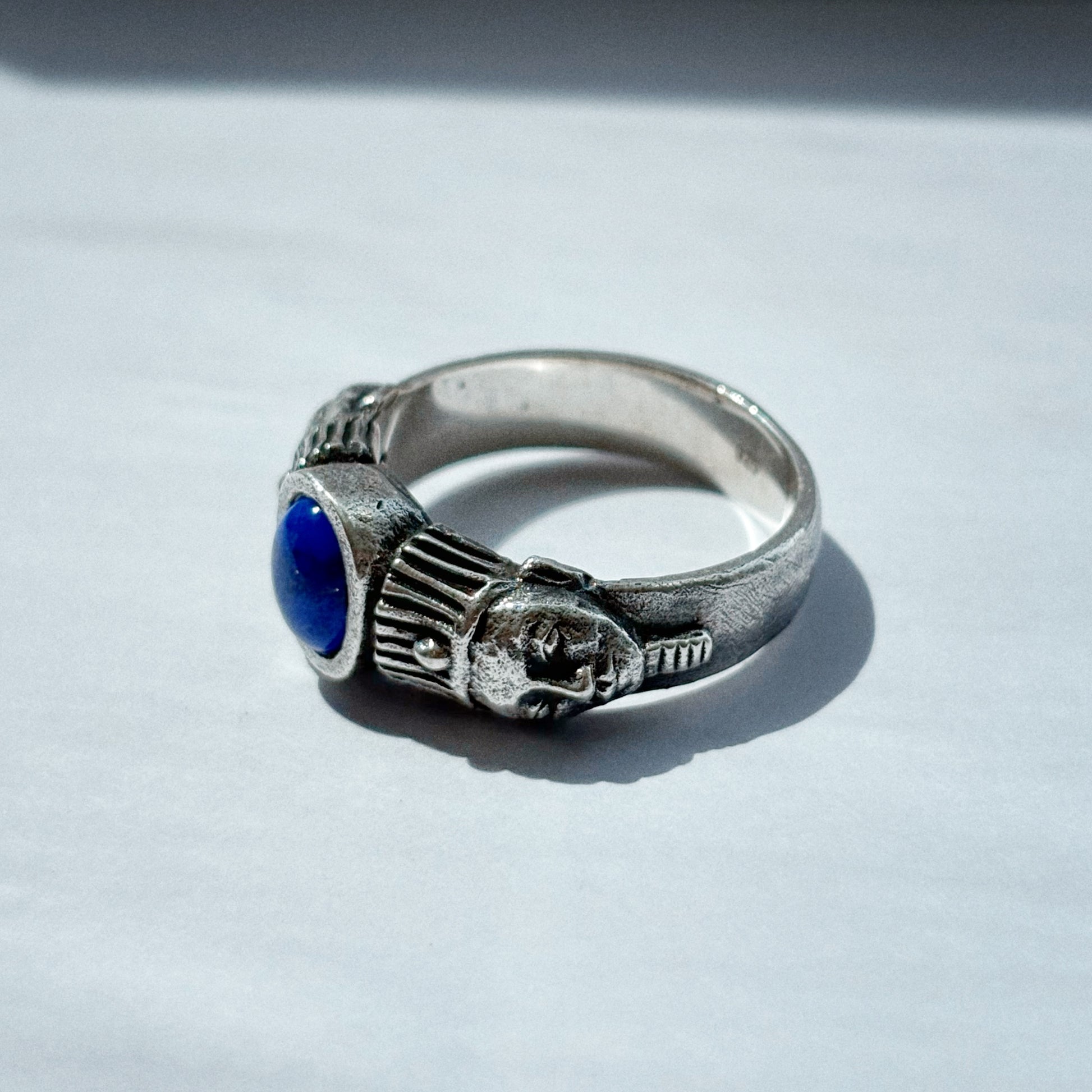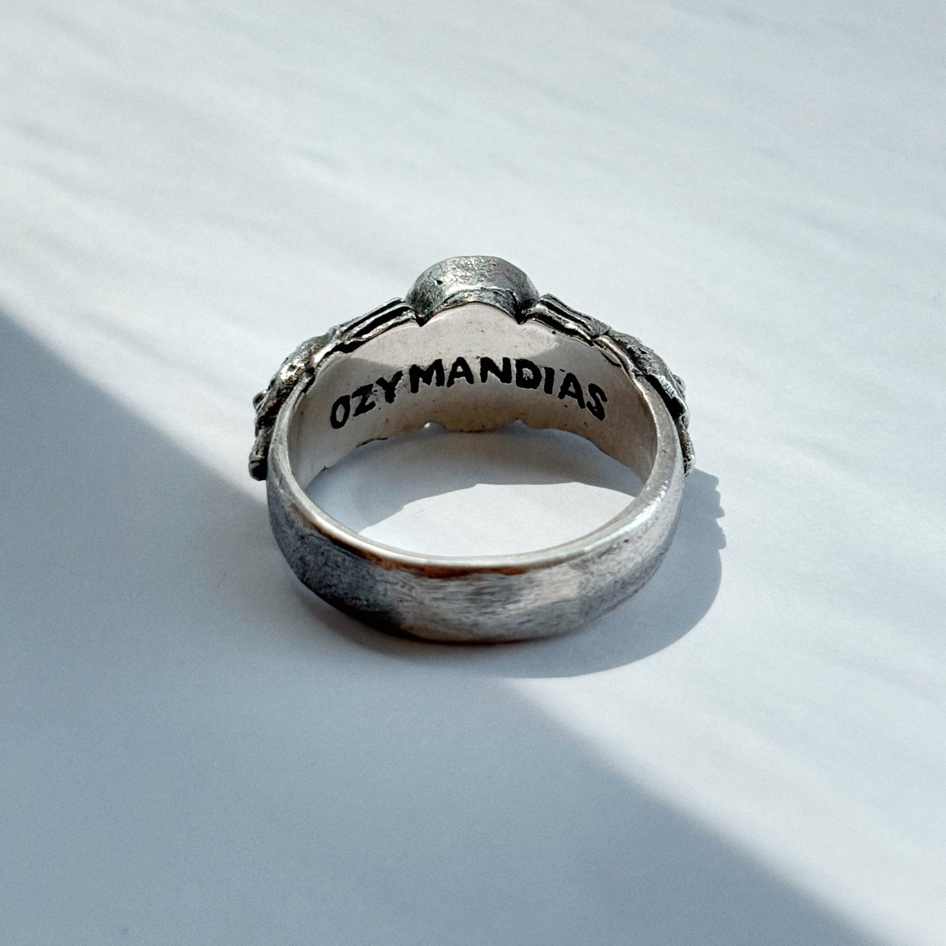Two detailed Ramses II figures are carved into the band, facing a cabochon lapis lazuli stone in the center. The word “OZYMANDIAS” is hand-engraved into the band: a reminder of Percy Shelley’s poem, and that even the mightiest of empires turn to dust.