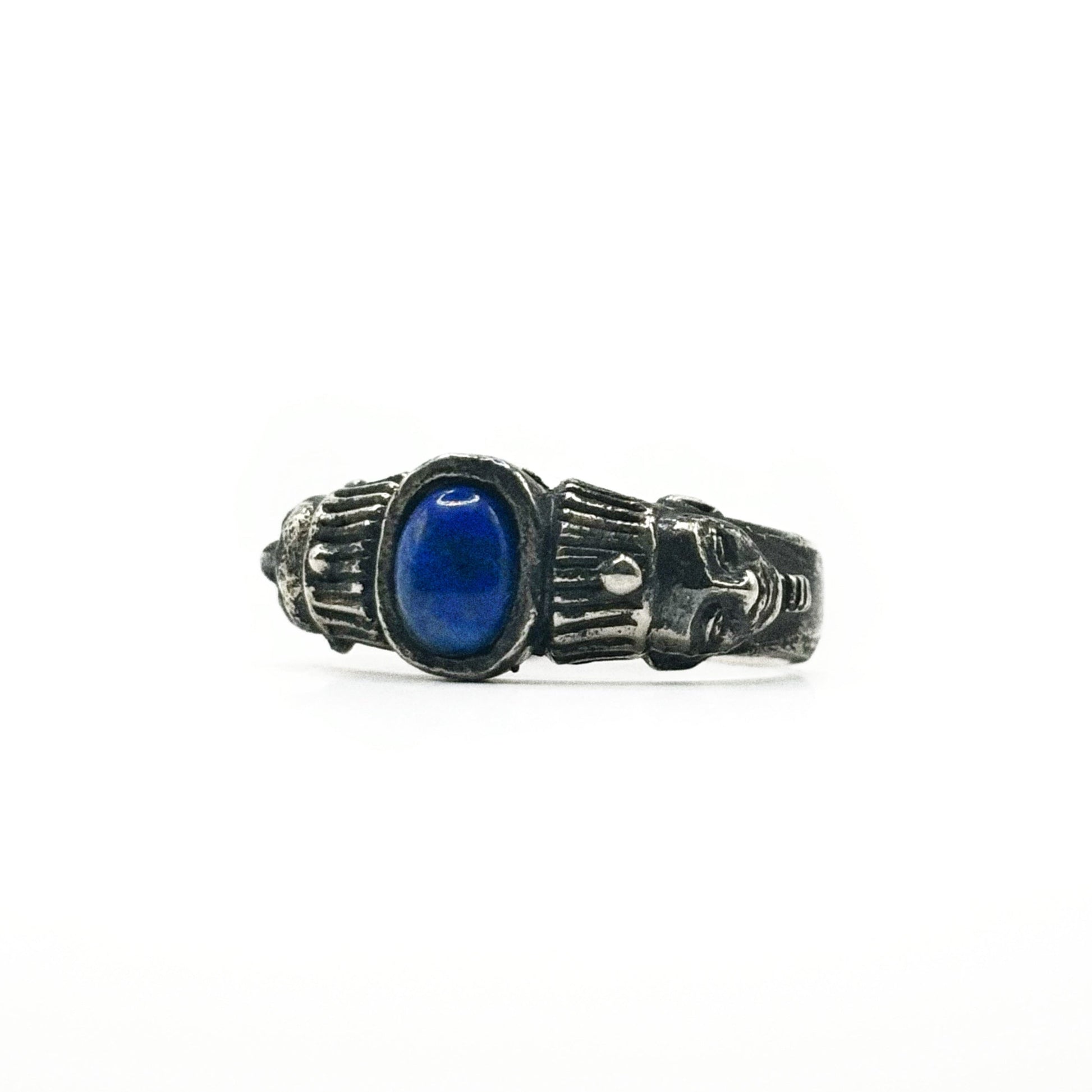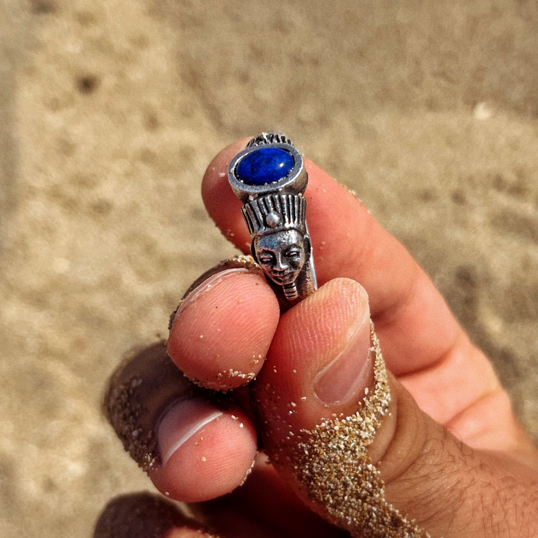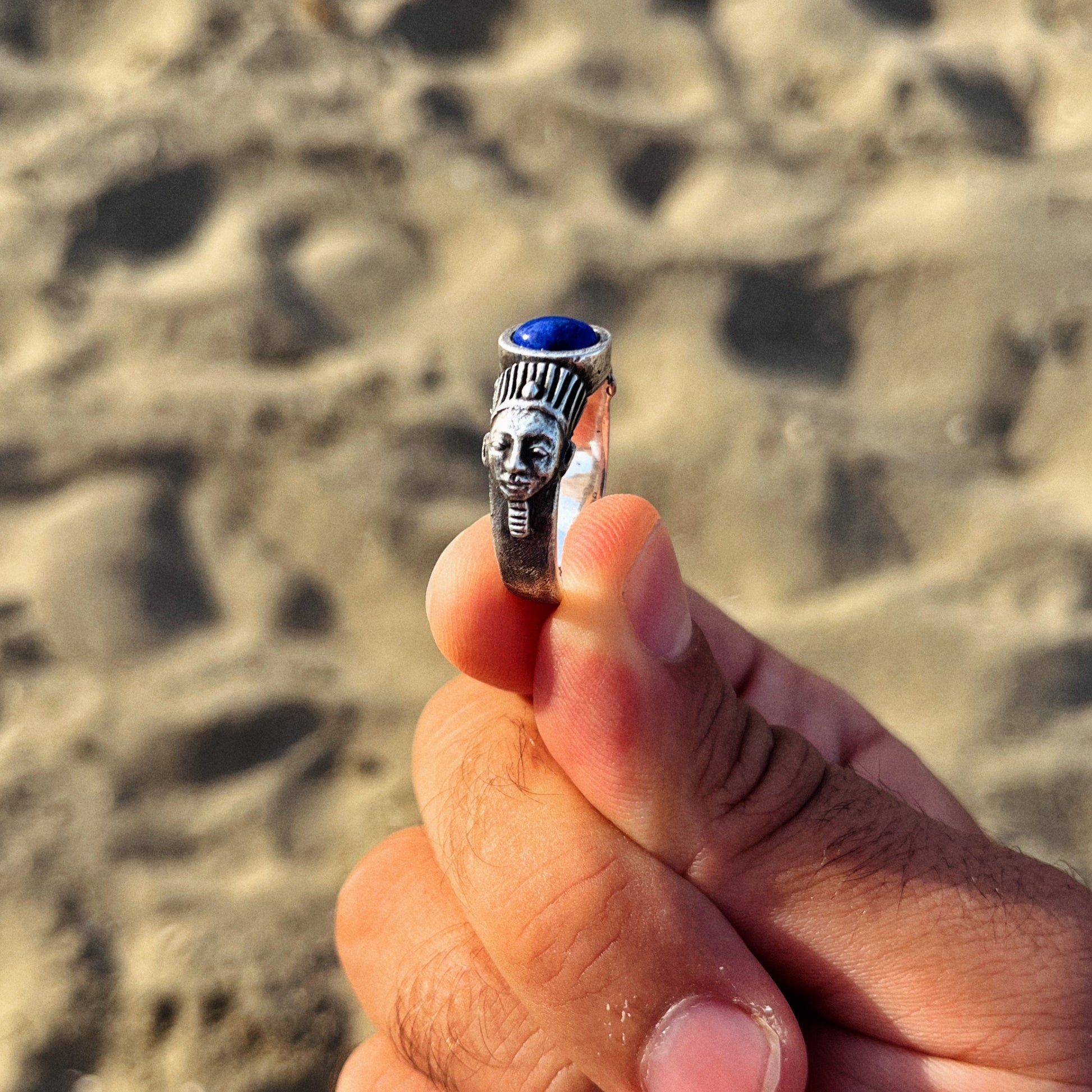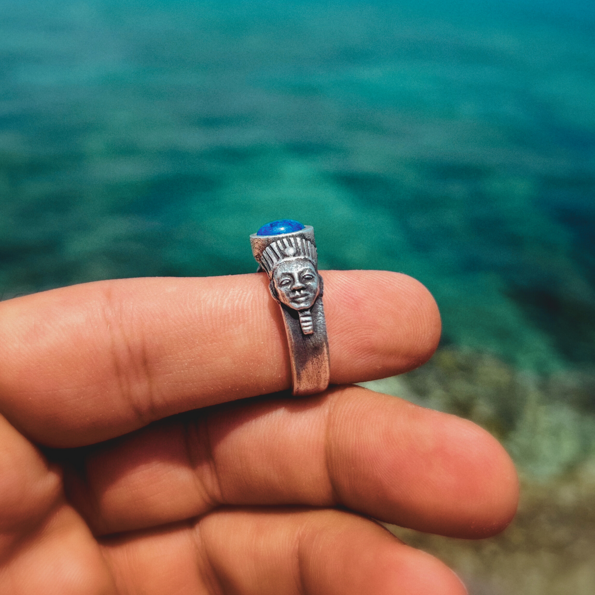 Two detailed Ramses II figures are carved into the band, facing a cabochon lapis lazuli stone in the center. The word “OZYMANDIAS” is hand-engraved into the band: a reminder of Percy Shelley’s poem, and that even the mightiest of empires turn to dust.