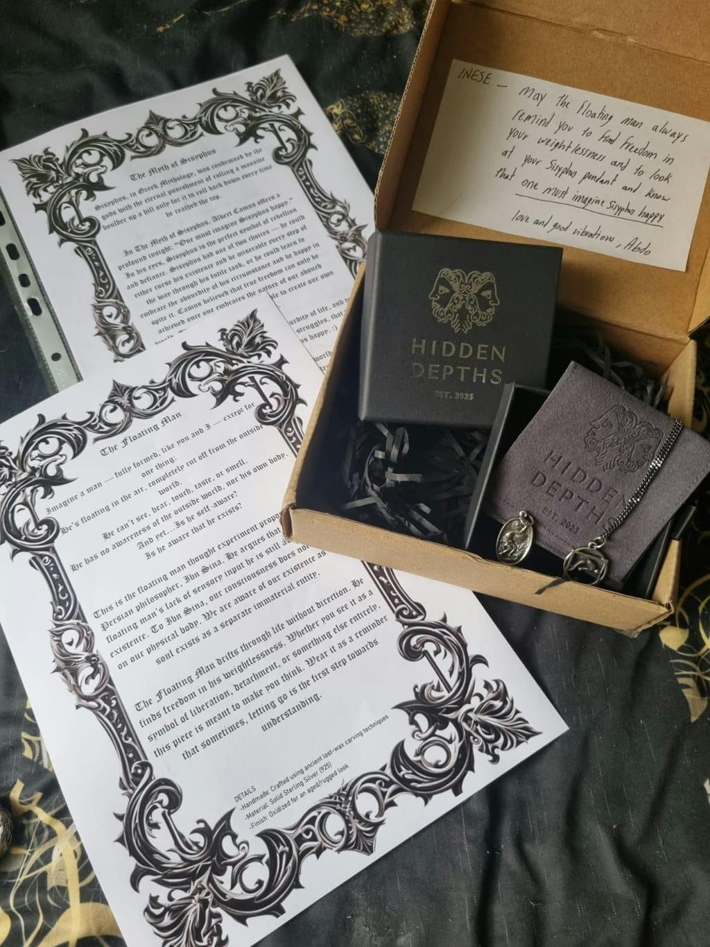 That is to say, this pendant is a reminder of the absurdity of life, and to always remember. Through all of our struggles, that we must always imagine Sisyphus happy. :)