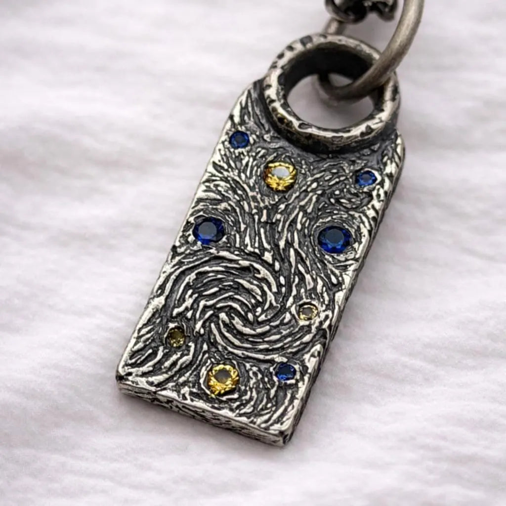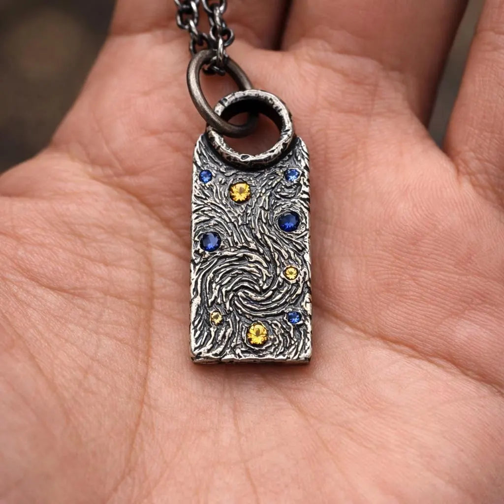 Our Van Gogh's Starry Night Necklace is inspired by the iconic artwork of Vincent Van Gogh and the visual language of his most famous masterpiece "The Starry Night"